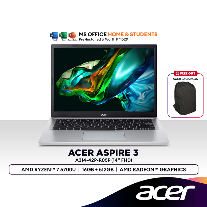 Acer Aspire 3 A314-42P-R05P 14″ FHD Laptop (AMD Ryzen™ 7 5700U |16GB | 512GB SSD | AMD Radeon™ Graphics | H&S)